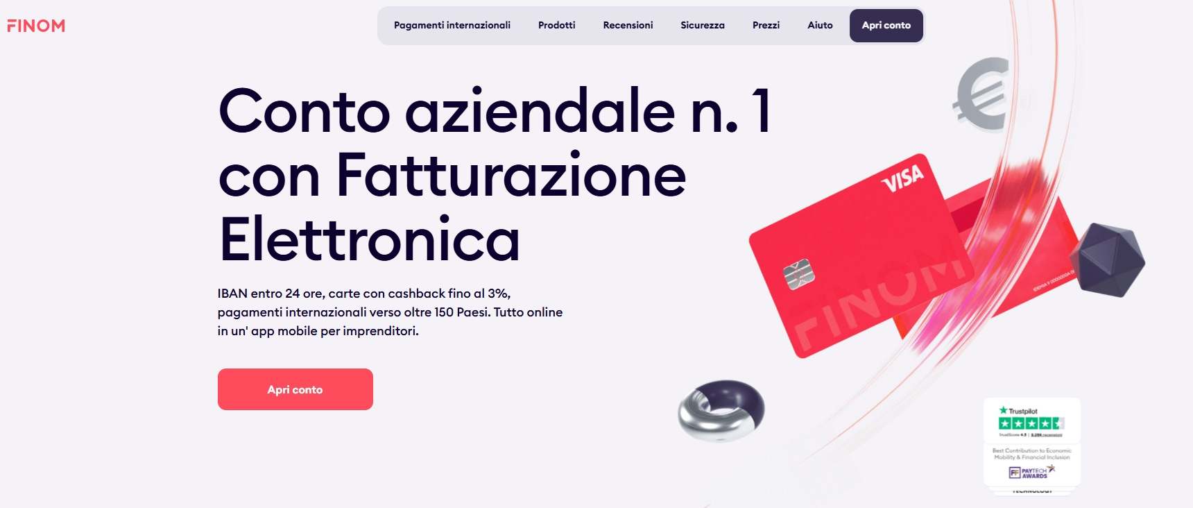 Finom (qui il sito ufficiale) è un conto corrente business la cui apertura è possibile online, che si rivolge a ditte individuali e liberi professionisti. Finom è una startup Fintech di origine finlandese, una realtà davvero molto giovane nata nel 2019, ma che in breve tempo ha acquisito un numero di clienti soddisfatti davvero molto corposo. Tra i motivi del suo successo troviamo sicuramente le moltissime funzionalità incluse nel conto.