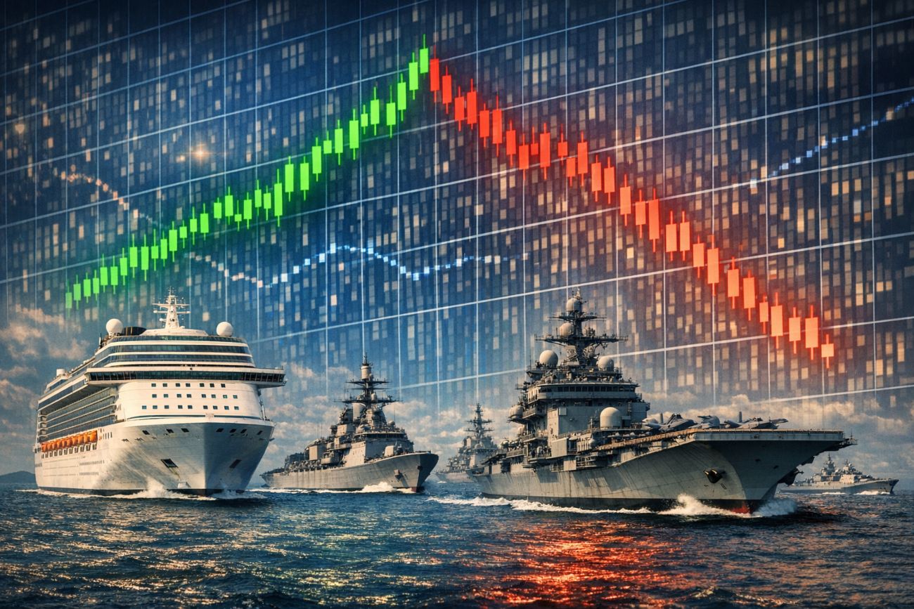 navi militari, navi da crociera e grafico di borsa sullo sfondo